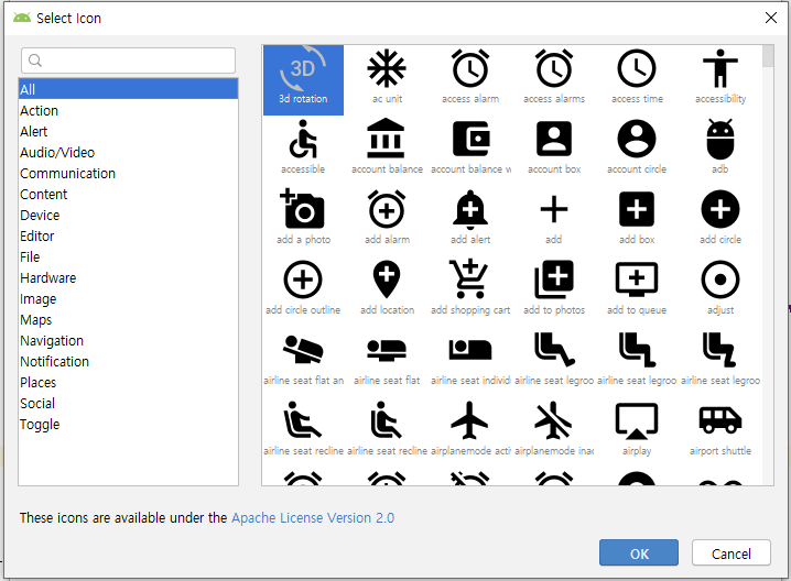 3. Select icon 창이 뜹니다. 제법 많은 아이콘들이 보입니다.