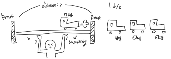 트럭 여러 대가 강을 가로지르는 일 차선 다리를 정해진 순으로 건너려 합니다. 모든 트럭이 다리를 건너려면 최소 몇 초가 걸리는지 알아내야 합니다. 트럭은 1초에 1만큼 움직이며, 다리 길이는 bridge_length이고 다리는 무게 weight까지 견딥니다. ※ 트럭이 다리에 완전히 오르지 않은 경우, 이 트럭의 무게는 고려하지 않습니다. 예를 들어, 길이가 2이고 10kg 무게를 견디는 다리가 있습니다. 무게가 [7, 4, 5, 6]kg인 트럭이 순서