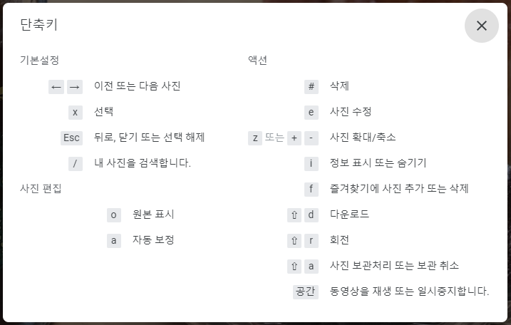 Google 포토에서는 사진 정리에 있어서 자주 사용되는 기능을 단축키로 제공해주고 있어서 활용하면 참 편합니다^-^