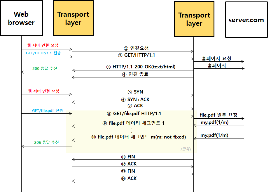 사용자 A가 server.com홈페이지에 들어가서 file.pdf파일을 다운로드 받을 때 TCP프로토콜 단에서 송수신하는 상황
