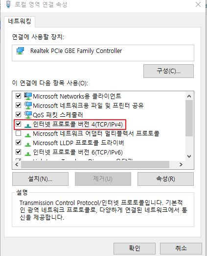 인터넷을 사용하기 위한 TCP/IP 프로토콜을 확인할 수 있다.